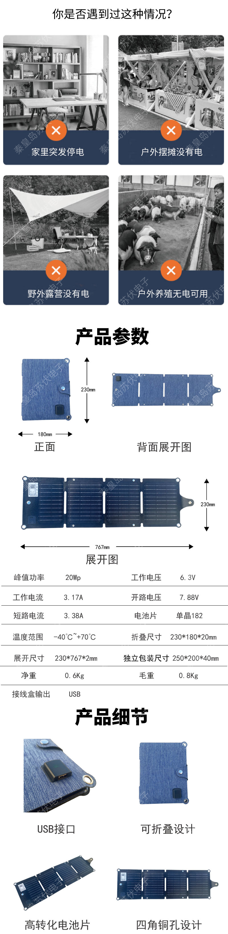 秦皇島新品20W便攜式太陽能折疊包可移動電源四折光伏充電板工廠